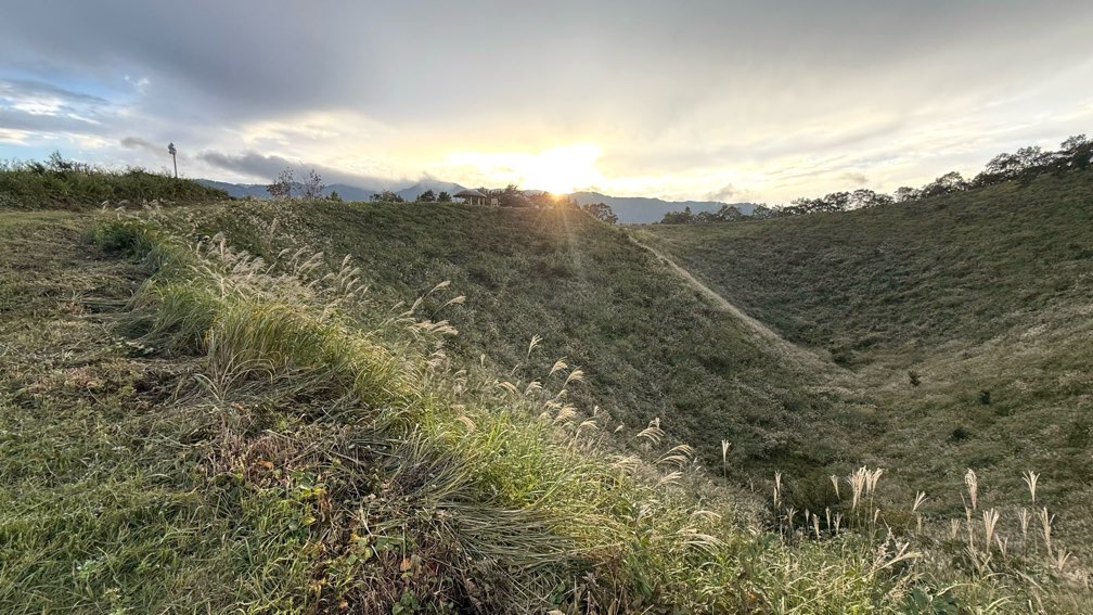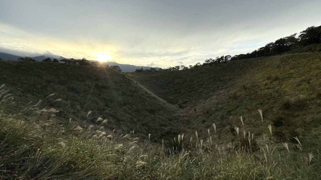 夕日を浴びた神鍋の火口に、しばし思いを馳せて深呼吸。ゆっくりゆっくり下山しだしたのでした。